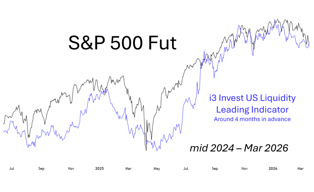 i3 Invest leading Indicator : Our proprietary indicator, based on U.S. liquidity, is designed to anticipate the direction of the equity market with a high degree of accuracy. As shown in the example below, it has demonstrated strong predictive power from mid-2023 through March 2026.